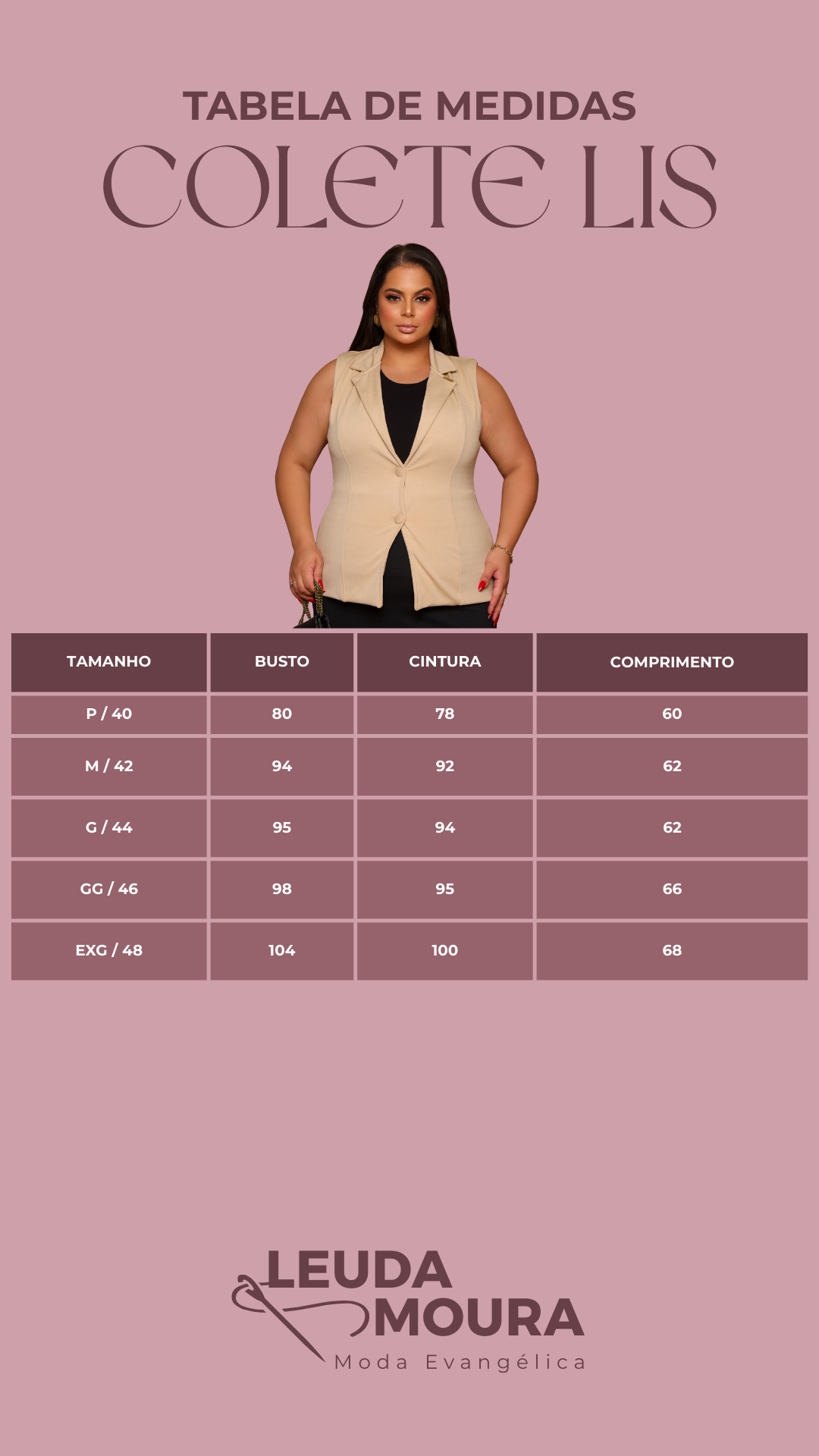 O Colete Lis é a definição de sofisticação e versatilidade para a mulher que busca um guarda-roupa inteligente. Confeccionado com atenção aos detalhes, ele é um multiplicador de looks, capaz de transformar o básico em algo extraordinário.