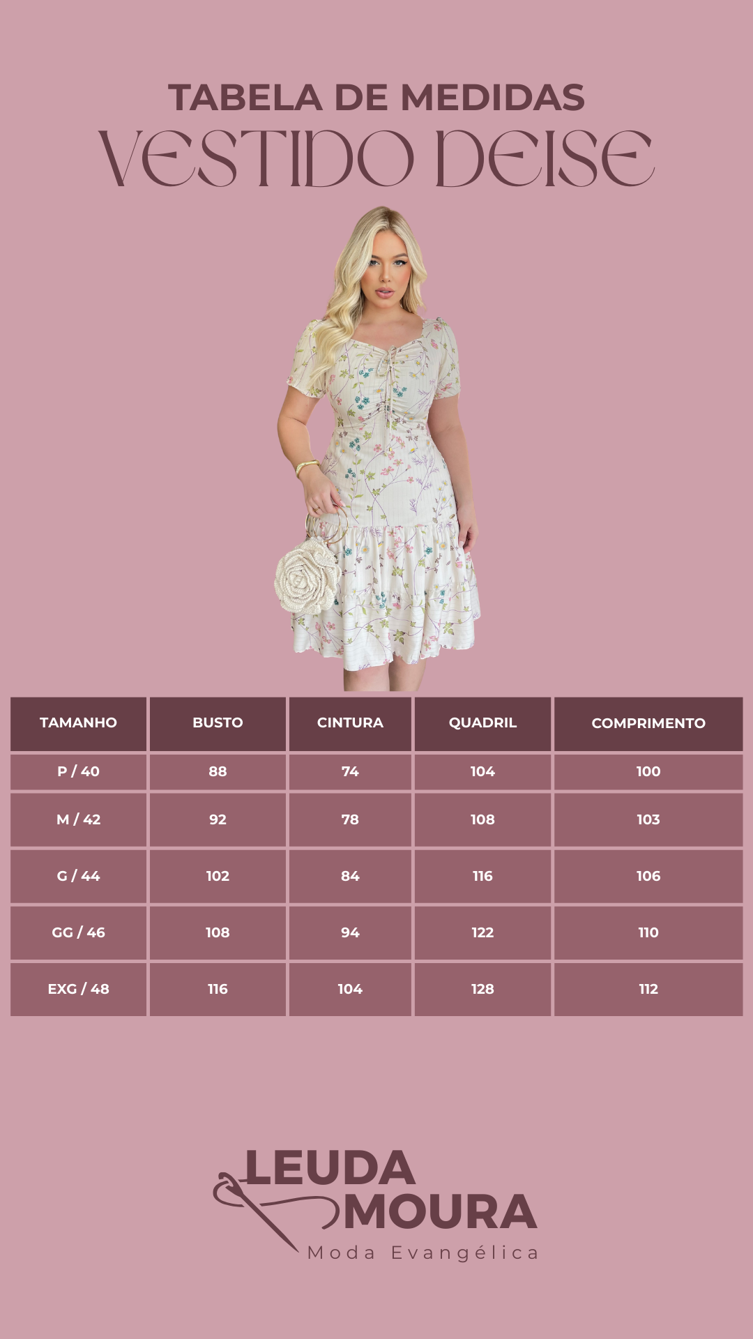 O Vestido Deise é a tradução da delicadeza e elegância para a mulher evangélica que busca uma peça que combine romantismo e sofisticação. Com uma estampa floral que exala suavidade e um design cuidadosamente elaborado, este vestido é a escolha perfeita para criar um visual encantador.